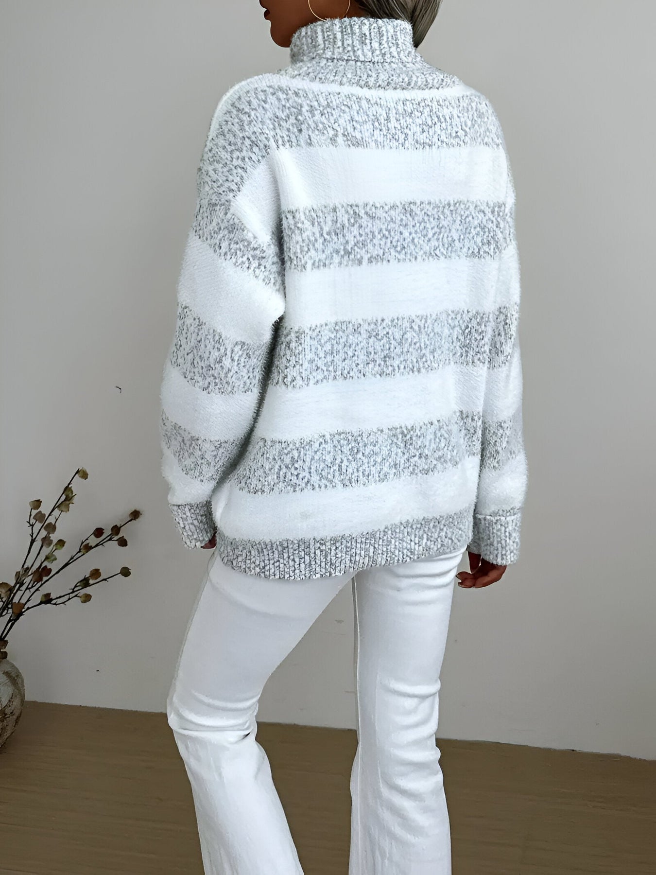 Stell dir vor, du gehst an einem frischen Herbstmorgen spazieren, eingehüllt in die Wärme und Weichheit dieses wunderschön gefertigten Rollkragenpullovers. Mit seinem gemütlichen Streifenmuster und dem lockeren Schnitt ist er der perfekte Begleiter für kühle Tage. Ob du zu Hause entspannst oder einen lockeren Spaziergang machst, dieser Pullover vereint mühelos Komfort und Stil und hält dich die ganze Saison über warm.