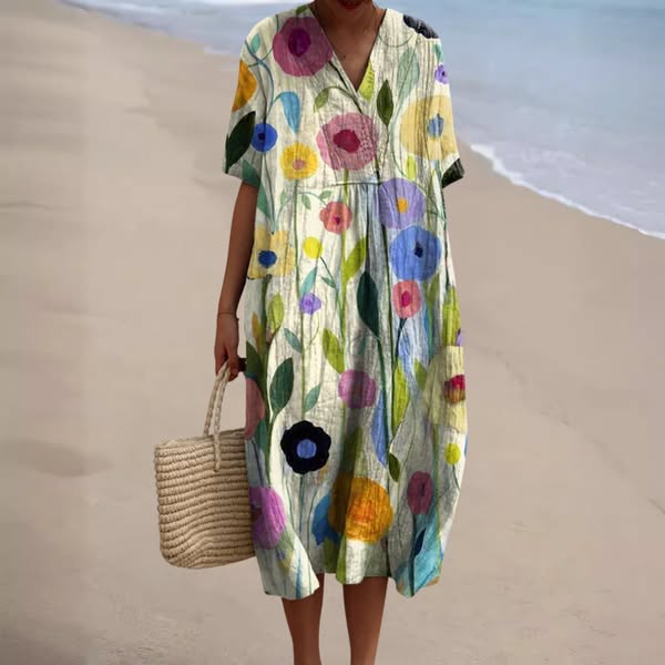Helle Blumenmuster verleihen dem Kleid einen Hauch von Spaß und Raffinesse und machen es zu einem Must-have für all Ihre Sommerausflüge.