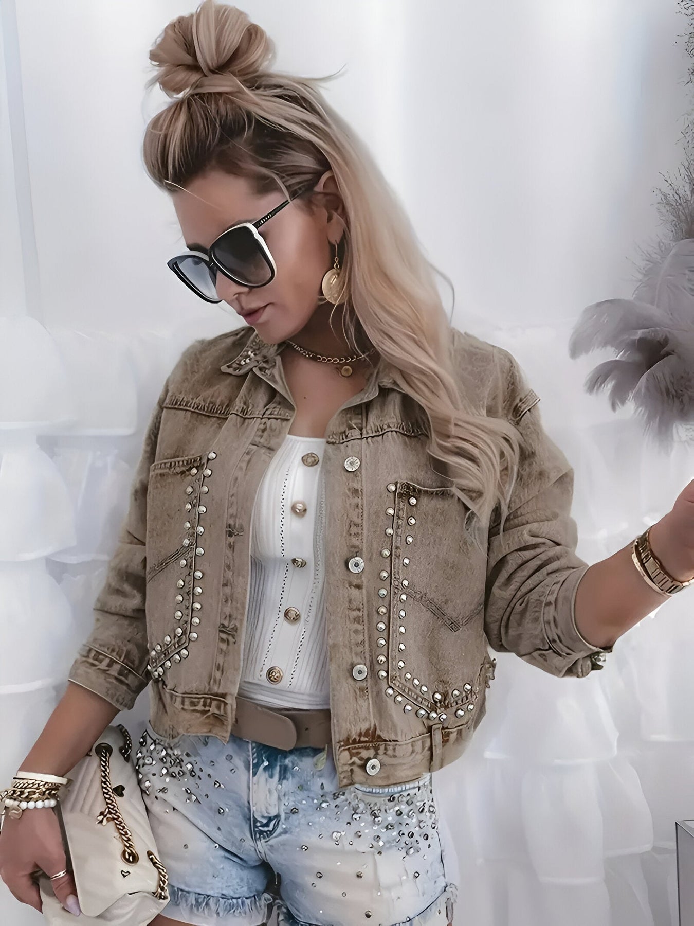 Stell dir vor, du schlüpfst in eine Jacke, die deinem Outfit sofort Stil verleiht. Diese lässige, mit Nieten verzierte Jeansjacke kombiniert Komfort und mutige Mode perfekt. Egal, ob du mit Freunden unterwegs bist oder einen Kaffee holst, diese Jacke rundet deinen Look mit Leichtigkeit und Selbstbewusstsein ab.