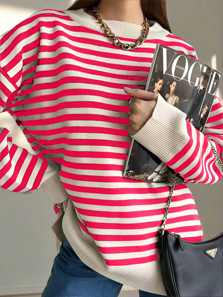 Entdecken Sie unseren oversized Strickpullover, der mühelose Eleganz mit außergewöhnlichem Komfort verbindet. Die gestreifte Musterung und die Wahl zwischen Rundhals- und V-Ausschnitt machen diesen Pullover zu einem vielseitigen Begleiter für unzählige Styling-Möglichkeiten. Die hochwertige Strickqualität sorgt für angenehme Wärme an kalten Wintertagen.
