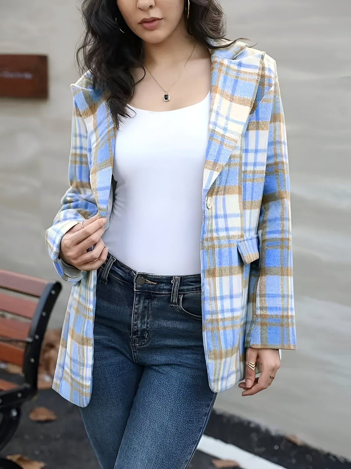Stell dir vor, du betrittst dein Büro mit Selbstvertrauen, der weiche Stoff dieses karierten Blazers umschmeichelt deinen Körper und verleiht deinem professionellen Look eine elegante Note. Ob bei einem Meeting oder am Schreibtisch – dieses stilvolle Stück lässt dich den ganzen Tag über selbstbewusst und souverän fühlen.