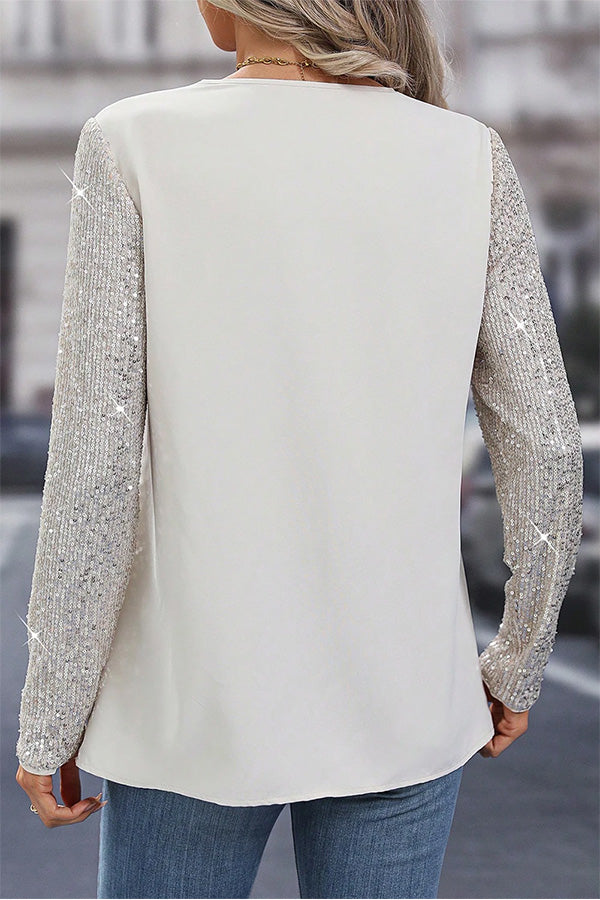 Eliza® | Weiße Patchwork-Bluse mit V-Ausschnitt und Paillettenärmeln