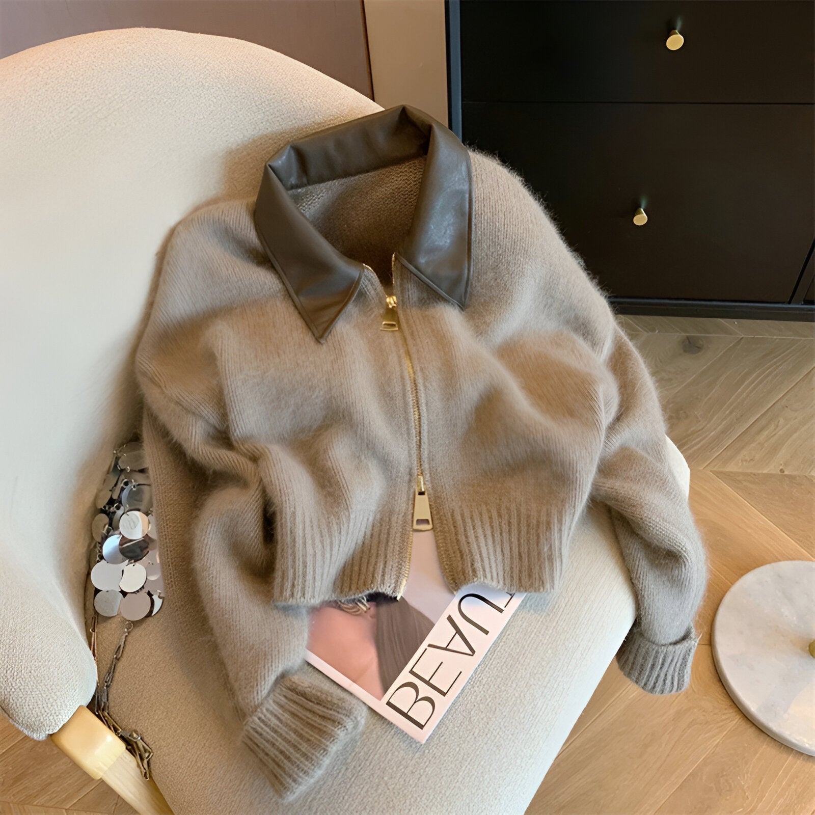 Hülle dich in Stil und Wärme mit diesem einzigartigen Strickpullover, der einen eleganten, geteilten Lederkragen und einen modernen Doppelreißverschluss bietet. Perfekt für kühlere Herbst- und Wintertage, vereint dieses modische Teil Komfort mit mutigem Streetstyle. Stell dir vor, du gehst für Erledigungen oder triffst dich auf einen Kaffee – dabei fühlst du dich kuschelig und gleichzeitig absolut im Trend mit diesem mühelos coolen Design.