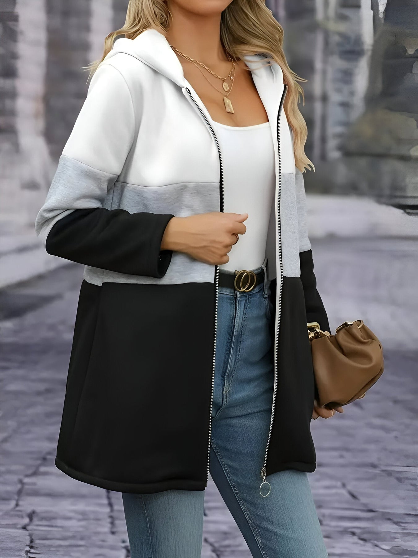 Stell dir vor, du tritt nach draußen an einem frischen Herbsttag, umhüllt von der perfekten Mischung aus Wärme und Stil. Diese elegante Color Block Jacke mit gemütlicher Kapuze und praktischen Taschen hält dich den ganzen Tag über komfortabel und modisch. Ob beim Erledigen von Besorgungen oder beim Treffen mit Freunden – diese Jacke ist die perfekte Wahl für einen mühelosen Look.