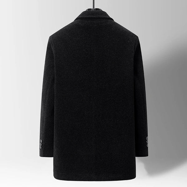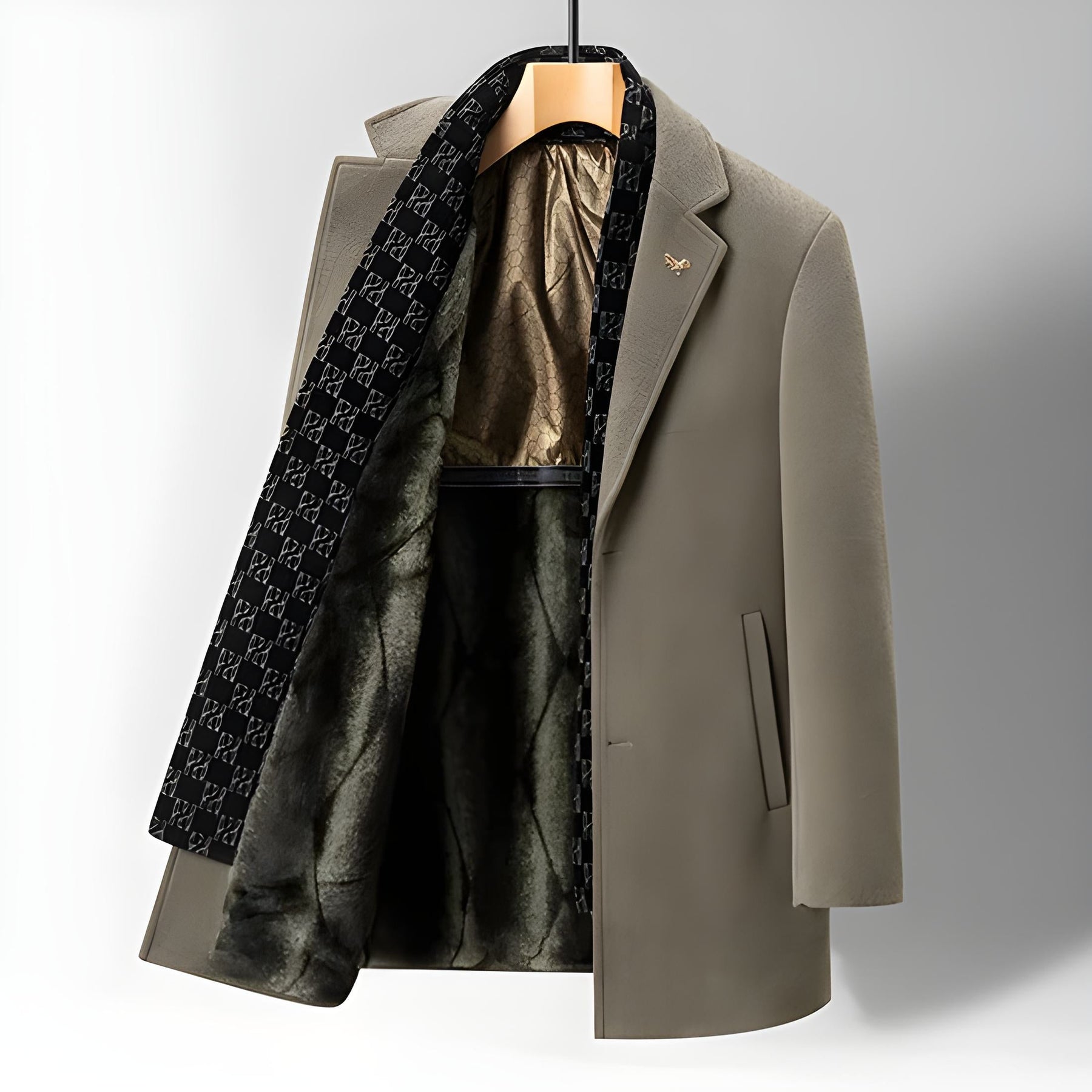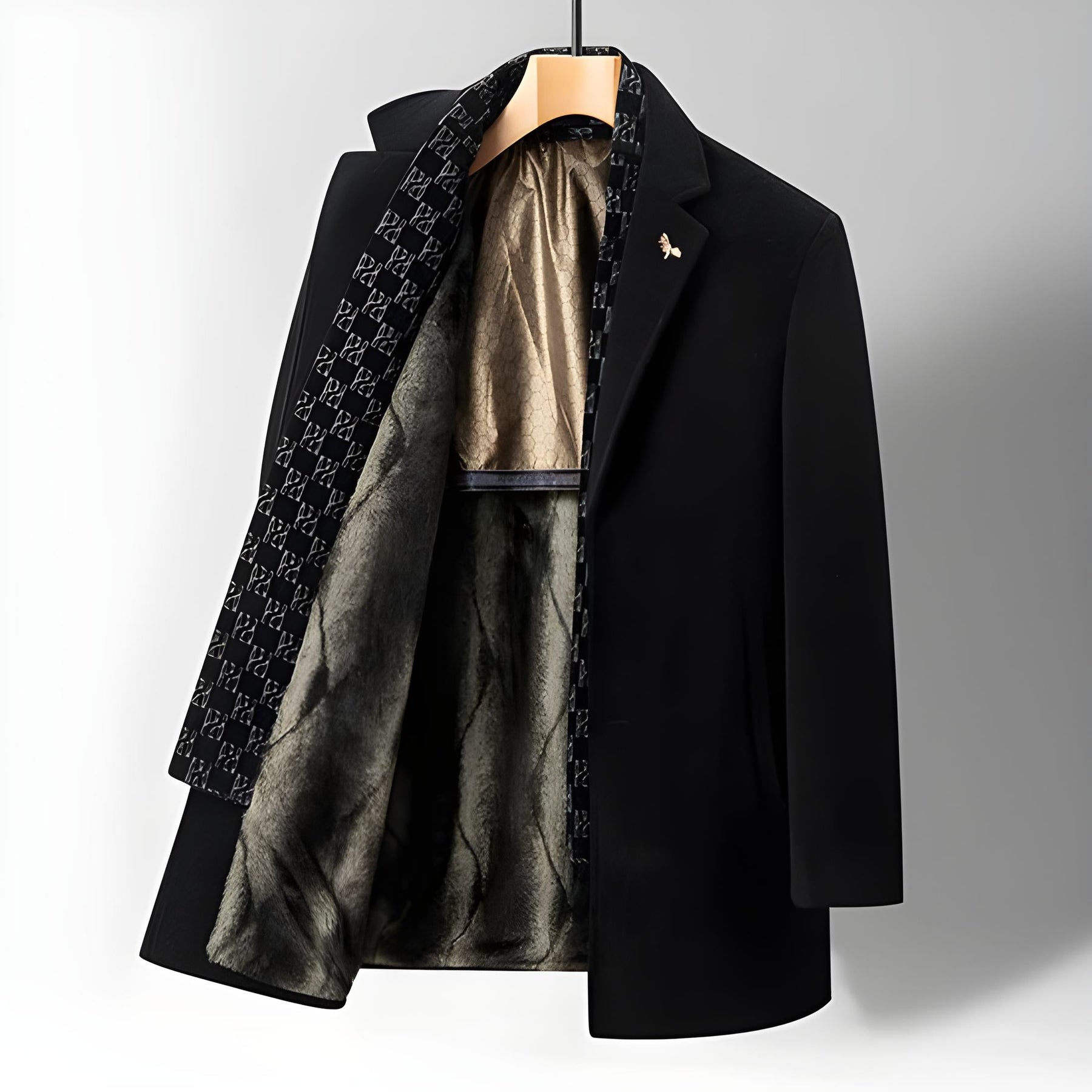 Ergänzen Sie Ihre Garderobe mit dem Herren Meister Herren Wollmantel Lang mit Vliesfutter – Ihr unverzichtbarer Begleiter für stilvolle Wintertage.