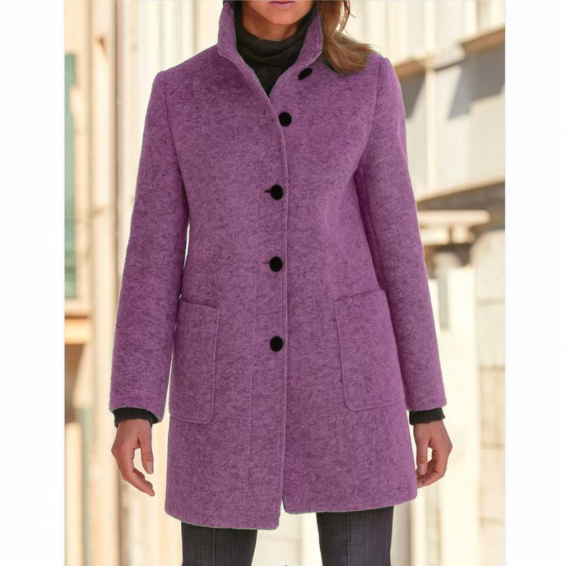 Dieser klassische Damenmantel aus Wolle überzeugt durch klare Linien und einen Retro-Knopfverschluss, der dem Design eine dezente Vintage-Note verleiht. Die schlichte Silhouette betont die elegante Ausstrahlung, während die verschiedenen Farbvarianten vielseitige Kombinationsmöglichkeiten bieten.