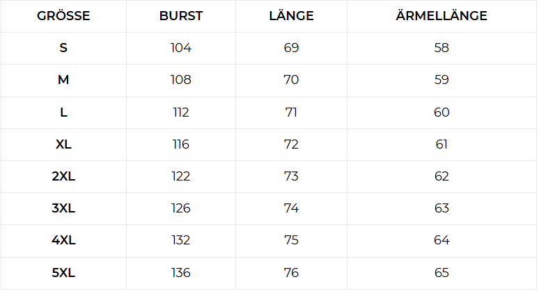 Größentabelle für Herrenoberteile (Shirt, Sweatshirt und Jacken)