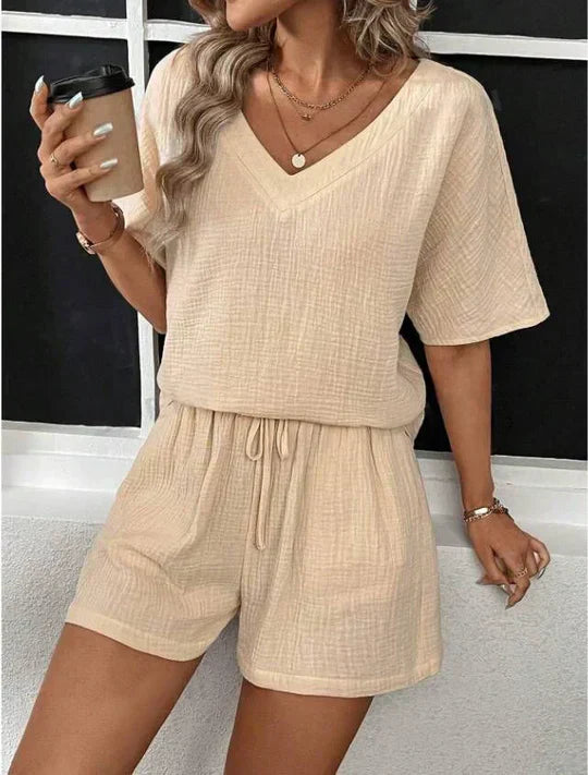 Das elegante zweiteilige Madeleine-Sommerset überzeugt durch sein stilvolles Design und die einfache Passform. Das hochwertige Material sorgt für Tragekomfort, während der harmonische Schnitt eine feminine Silhouette unterstreicht. Perfekt für sommerliche Anlässe oder lässige Freizeit-Looks.