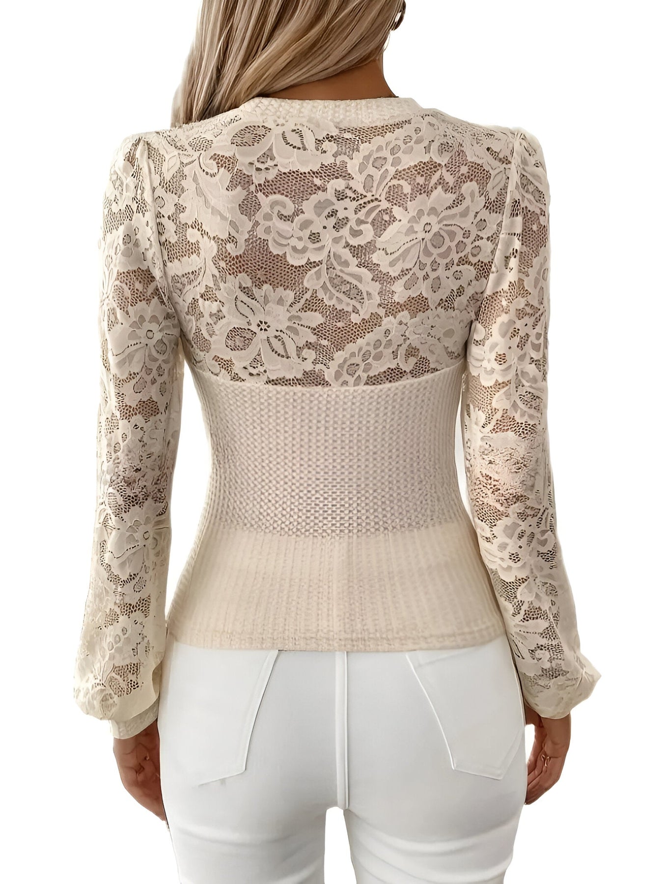 Die feine Spitze verleiht der Bluse eine feminine Note und hebt sie auf die nächste Stufe der Raffinesse – perfekt für jede Gelegenheit.