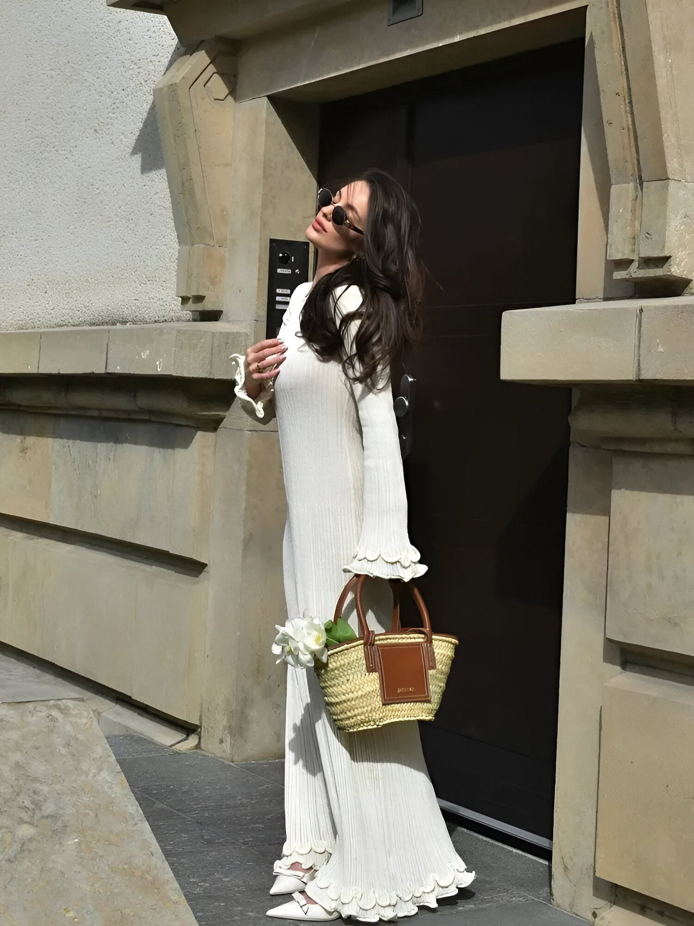 Stell dir vor: Ein Abend in der Stadt, ein Abendessen mit Freunden oder ein besonderes Ereignis. Du strahlst in diesem raffinierten, eleganten Kleid mit einem faszinierenden Rückendekolleté. Der detailreiche Rüschen-Saum verleiht deinem Look einen verspielten Flair, während die ausgestellten langen Ärmel deine Erscheinung noch raffinierter machen. Der leichte, atmungsaktive Stoff sorgt dafür, dass du den ganzen Abend über bequem und gleichzeitig stilvoll bleibst.