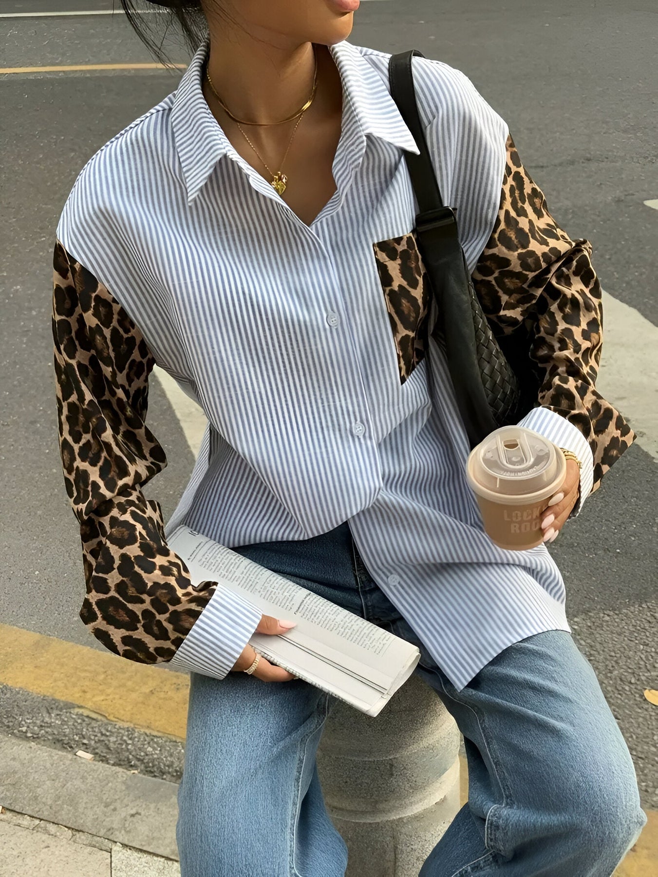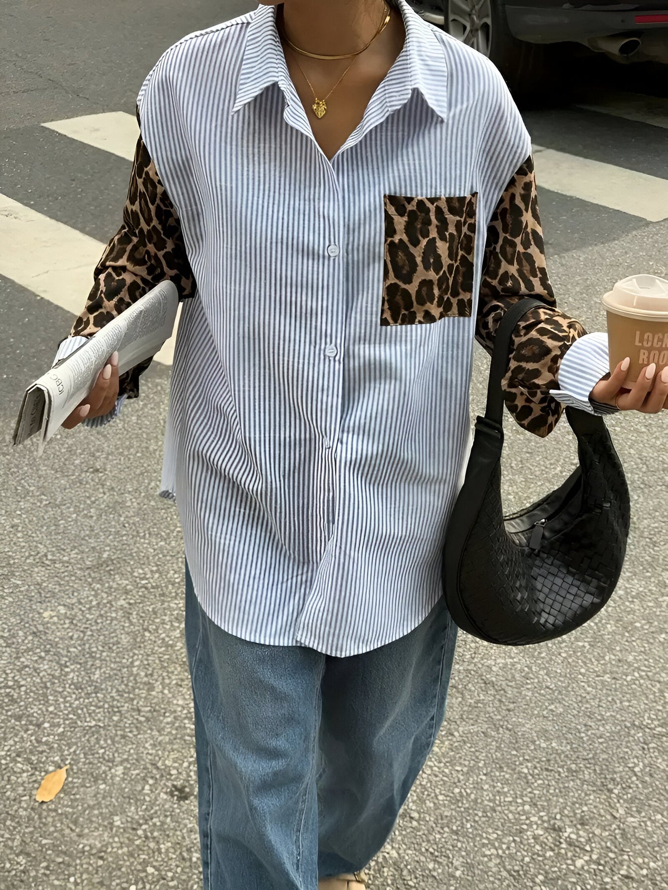 Stell dir vor, du trittst in einer Bluse auf, die kühne und elegante Elemente perfekt miteinander vereint und dich sowohl mutig als auch modisch fühlen lässt. Dieses elegante, ganzjährig tragbare gewebte Hemd kombiniert auffälligen Leoparden-Print mit klassischen Streifen und sorgt so für einen einzigartigen, aufmerksamkeitsstarken Look bei jeder Gelegenheit.