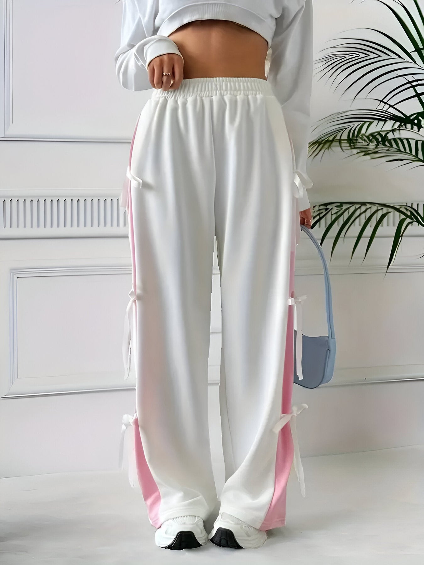 Stell dir vor, du schlüpfst in eine Hose, die sich genauso gut anfühlt, wie sie aussieht. Diese lässigen weißen Sporthosen bieten die perfekte Balance aus Stil und Komfort und sind ideal für den Herbst und Winter. Der elastische Bund sorgt für eine bequeme Passform, während das charmante Schleifendetail deinem Look eine verspielte Note verleiht. Ob du dich zu Hause entspannst oder Besorgungen machst, diese Hose hält dich den ganzen Tag über selbstbewusst und bequem.
