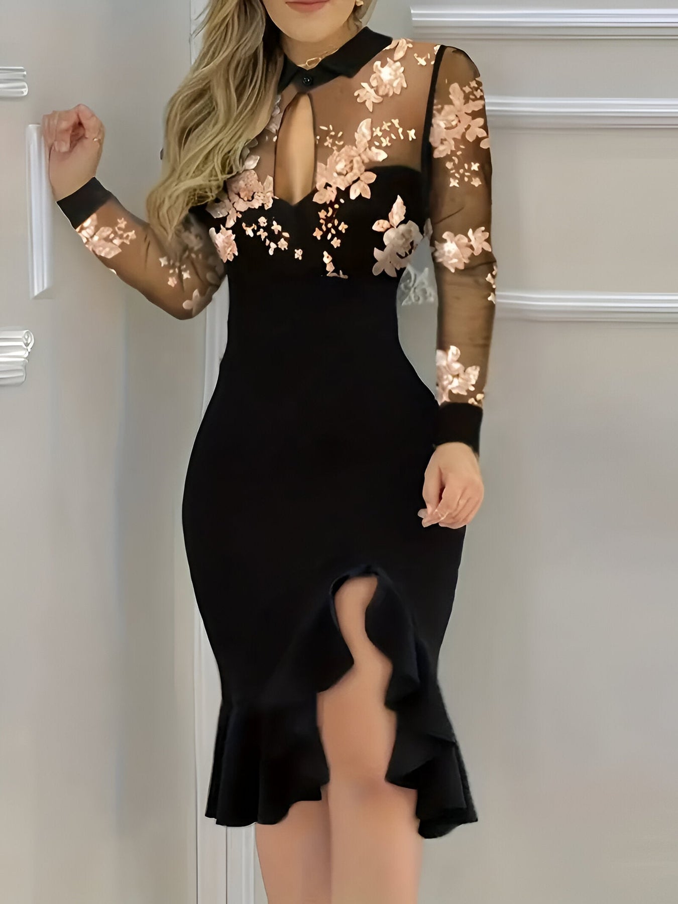 Tauche ein in Eleganz mit diesem atemberaubenden Kleid im floralen Druck, das dafür gemacht ist, dich bei jedem Event ins Rampenlicht zu rücken. Stell dir vor, wie du in den weichen, atmungsaktiven Stoff schlüpfst und das Selbstbewusstsein spürst, während das filigrane Mesh-Stitching deine Kurven umschmeichelt. Ob bei einer Gartenparty, einem Cocktailabend oder einem besonderen Date – dieses Kleid macht dich zum Mittelpunkt der Aufmerksamkeit.