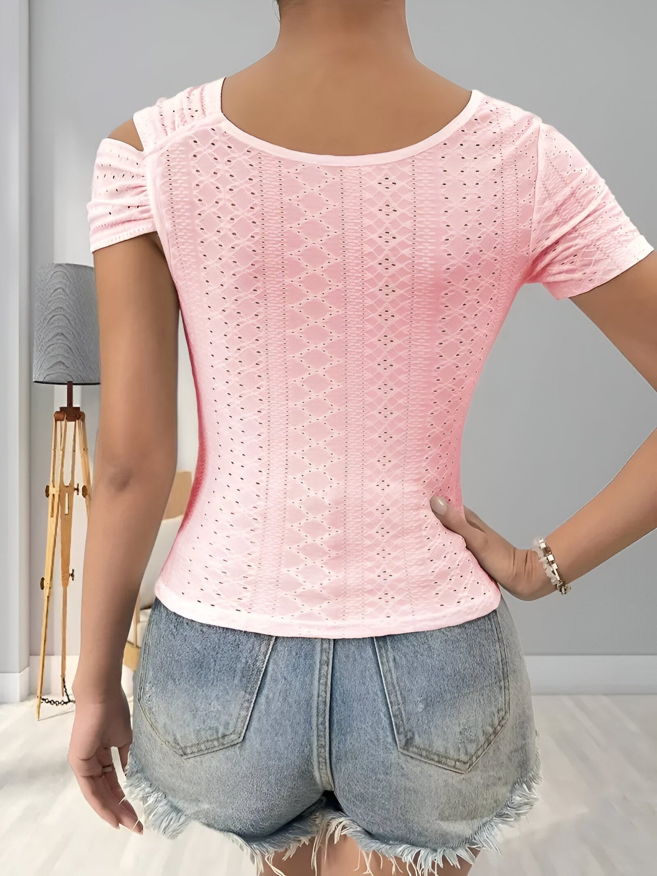 Das einzigartige asymmetrische Schulterdesign und die Cutout-Details schaffen einen mutigen, modischen Look, der dich in jeder Menge hervorhebt.