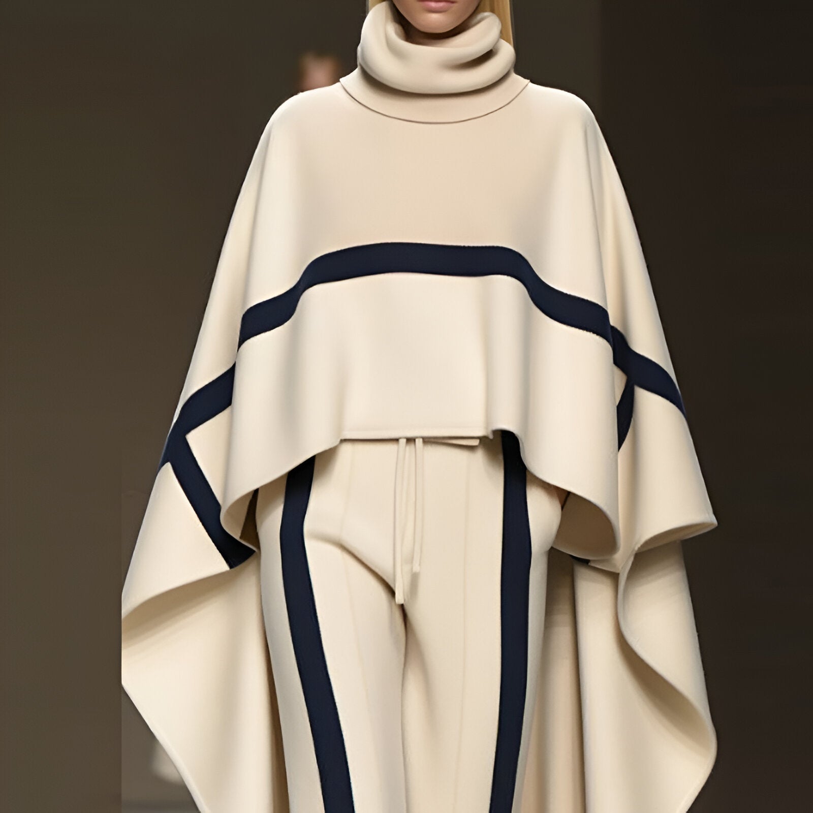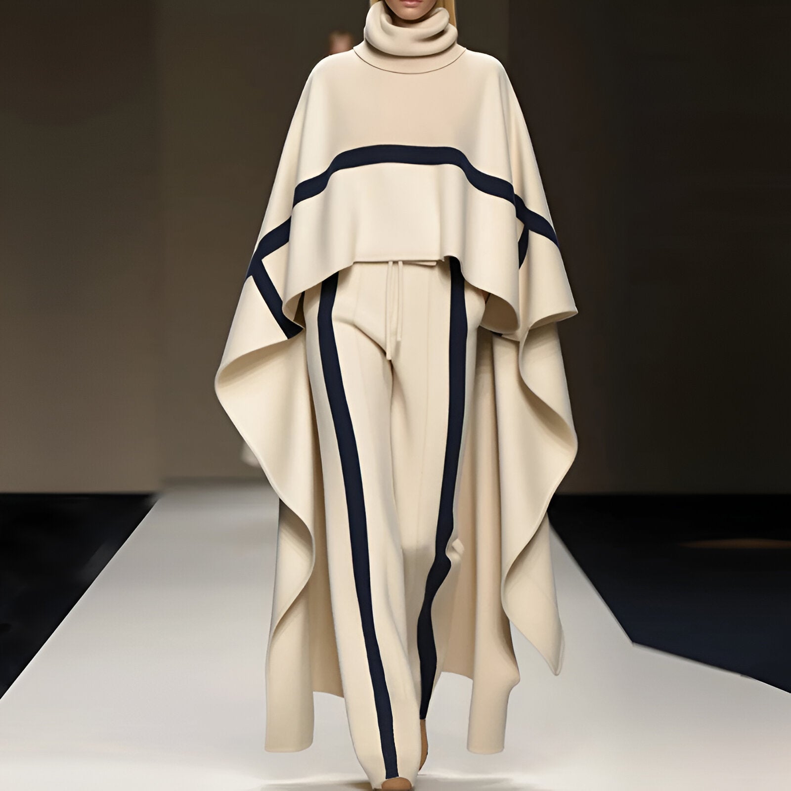 Die lockere, entspannte Passform des Rollkragenmantels und der langen Hose sorgt für maximalen Komfort, ohne auf Stil zu verzichten. Fühl die Freiheit, dich zu bewegen und dabei stets gepflegt und zusammen. Perfekt für jede Gelegenheit, passt sich dieses Set deinem Tag mühelos an.