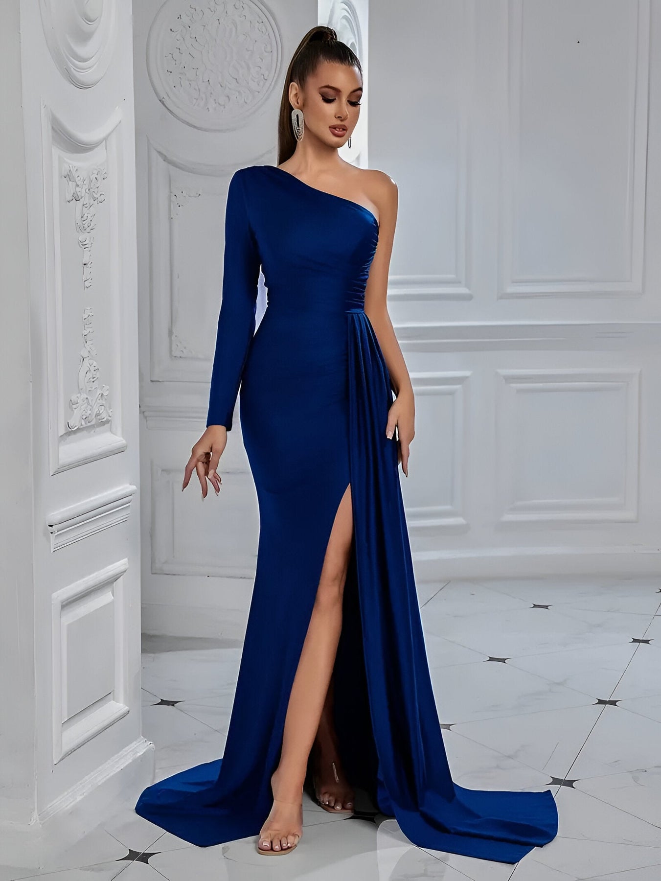 Treten Sie ins Rampenlicht mit diesem luxuriösen, einseitigen, drapierten Seidenkleid. Perfekt für unvergessliche Nächte, bietet dieses elegante Abendkleid sowohl Raffinesse als auch Komfort. Ob Sie eine glamouröse Party oder ein formelles Bankett besuchen, Sie werden sich die ganze Nacht über umwerfend und selbstbewusst fühlen.