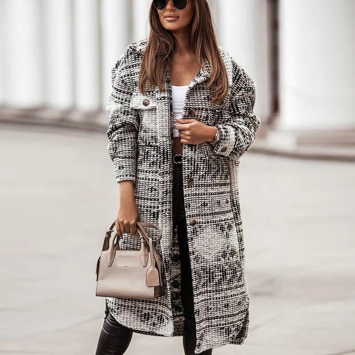 Der Schwarze Retro-Mantel mit Muster - Clara bringt einen Hauch von Vintage-Charme in deine Garderobe. Mit seinem eleganten Retro-Muster und dem klassischen Ein-Knopf-Design ist dieser lange Mantel die perfekte Wahl für modebewusste Frauen. Ideal für kühle Herbst- und Wintertage, hält er dich warm, während du in einem stilvollen Look unterwegs bist.