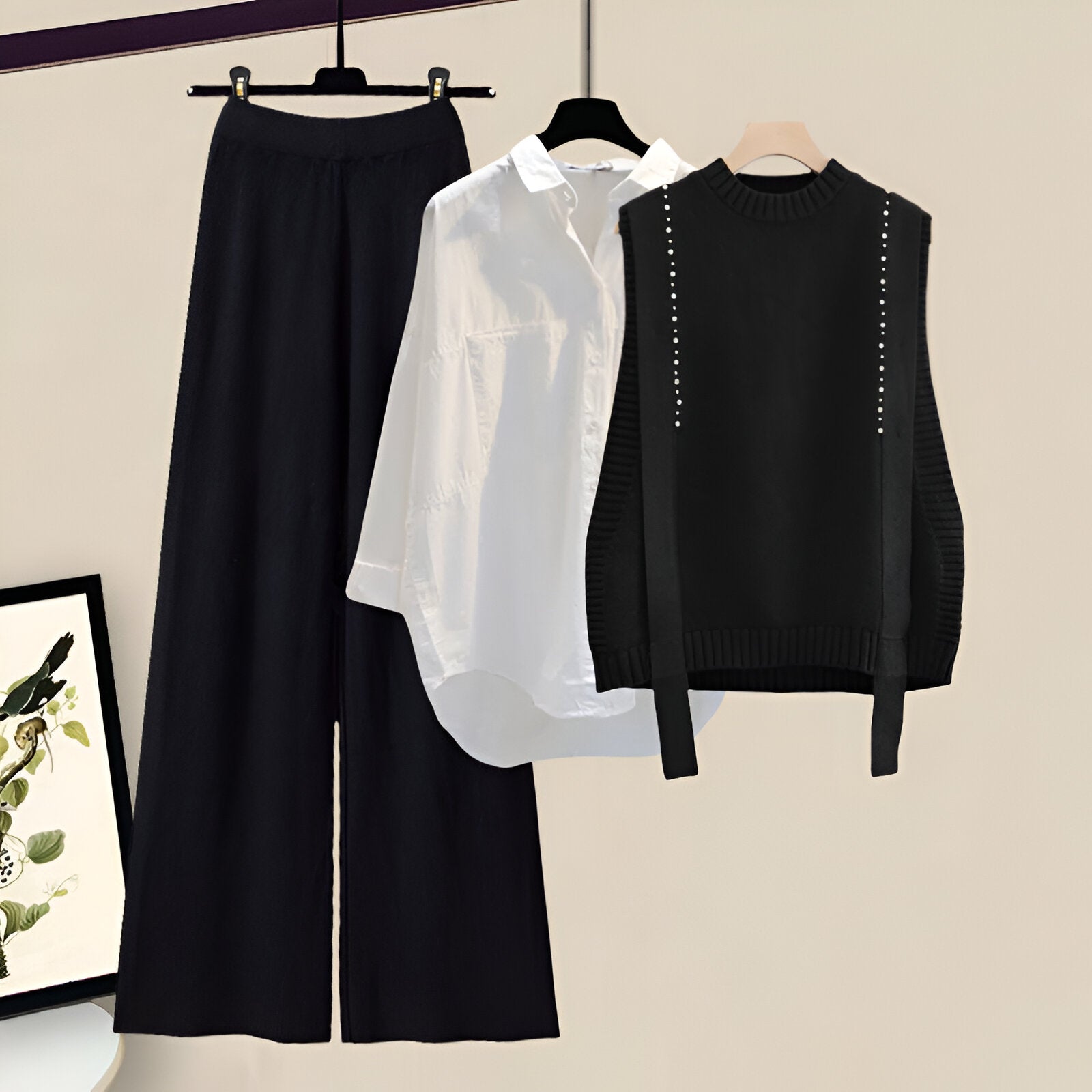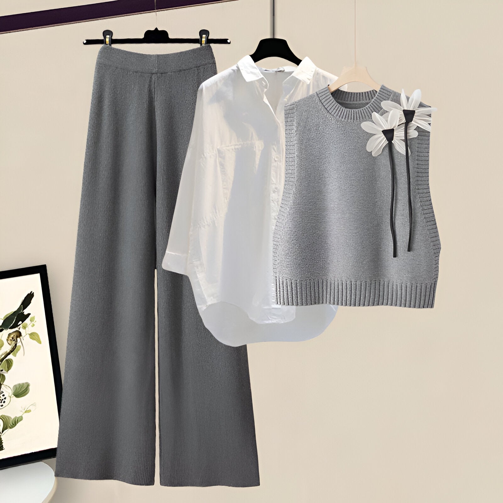 Stell dir vor, du wickelst dich in ein schickes, gemütliches 3-Teile-Set, das Komfort und Stil perfekt miteinander vereint. Ob du zu Hause entspannst oder mit Freunden einen Kaffee trinkst, dieses Outfit lässt dich selbstbewusst, stilvoll und mühelos gut aussehen. Die weiche Strickjacke, kombiniert mit einem weißen Hemd und weiten Hosen, schafft die perfekte Balance aus Wärme und Eleganz für die kälteren Monate.
