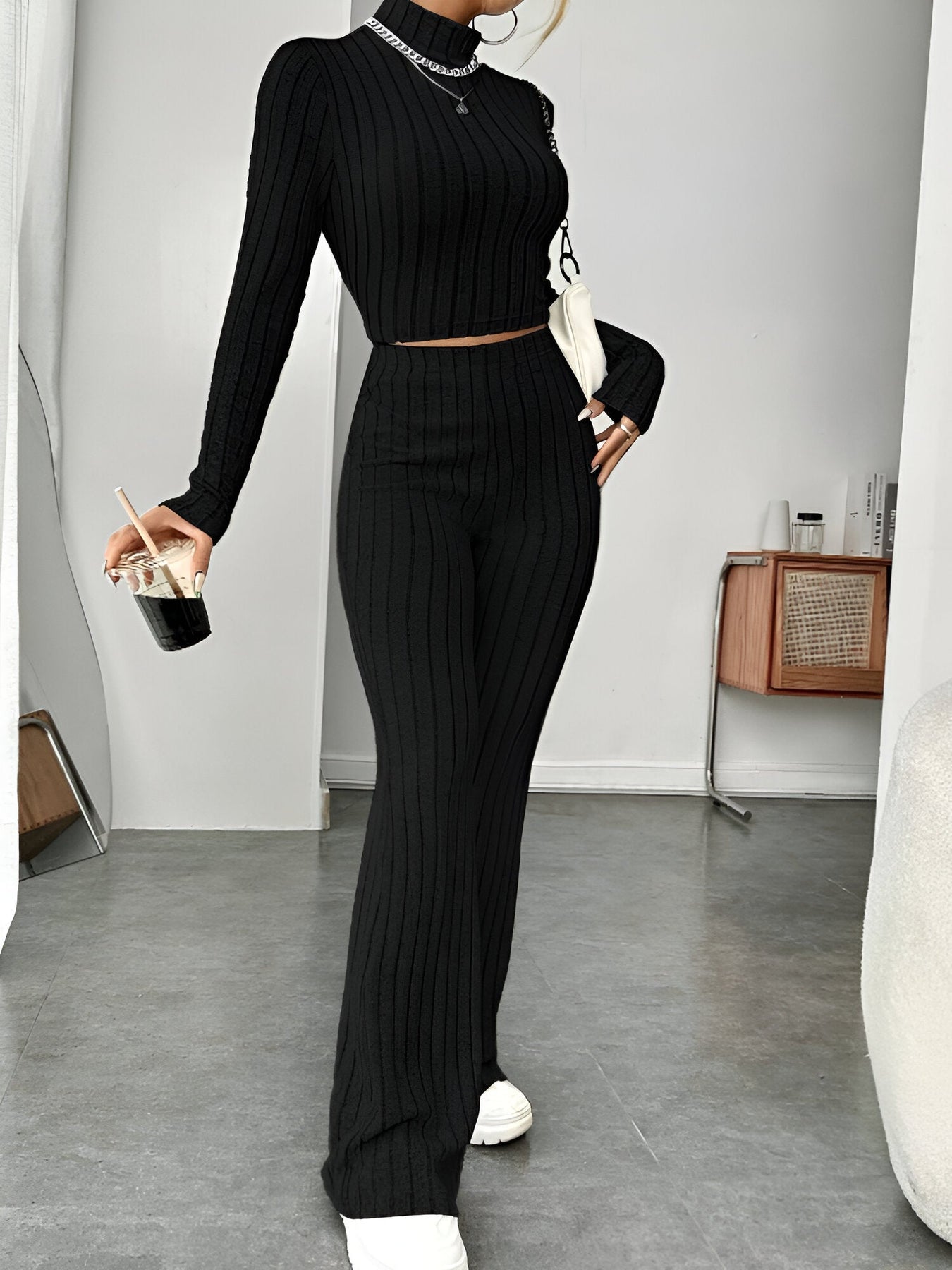 Stell dir vor, du beginnst deinen Tag in einem Outfit, das sowohl gemütlich als auch stilvoll ist. Dieses Zwei-Teile-Set mit weichem Strickstoff und einem schmeichelhaften Streifenmuster ist perfekt für jede Gelegenheit – vom entspannten Tag zu Hause bis hin zu einem lässigen Treffen mit Freunden. Der Stehkragen und die langen Ärmel halten dich warm, während die schlanken Hosen dir einen modernen, schmeichelhaften Look verleihen.