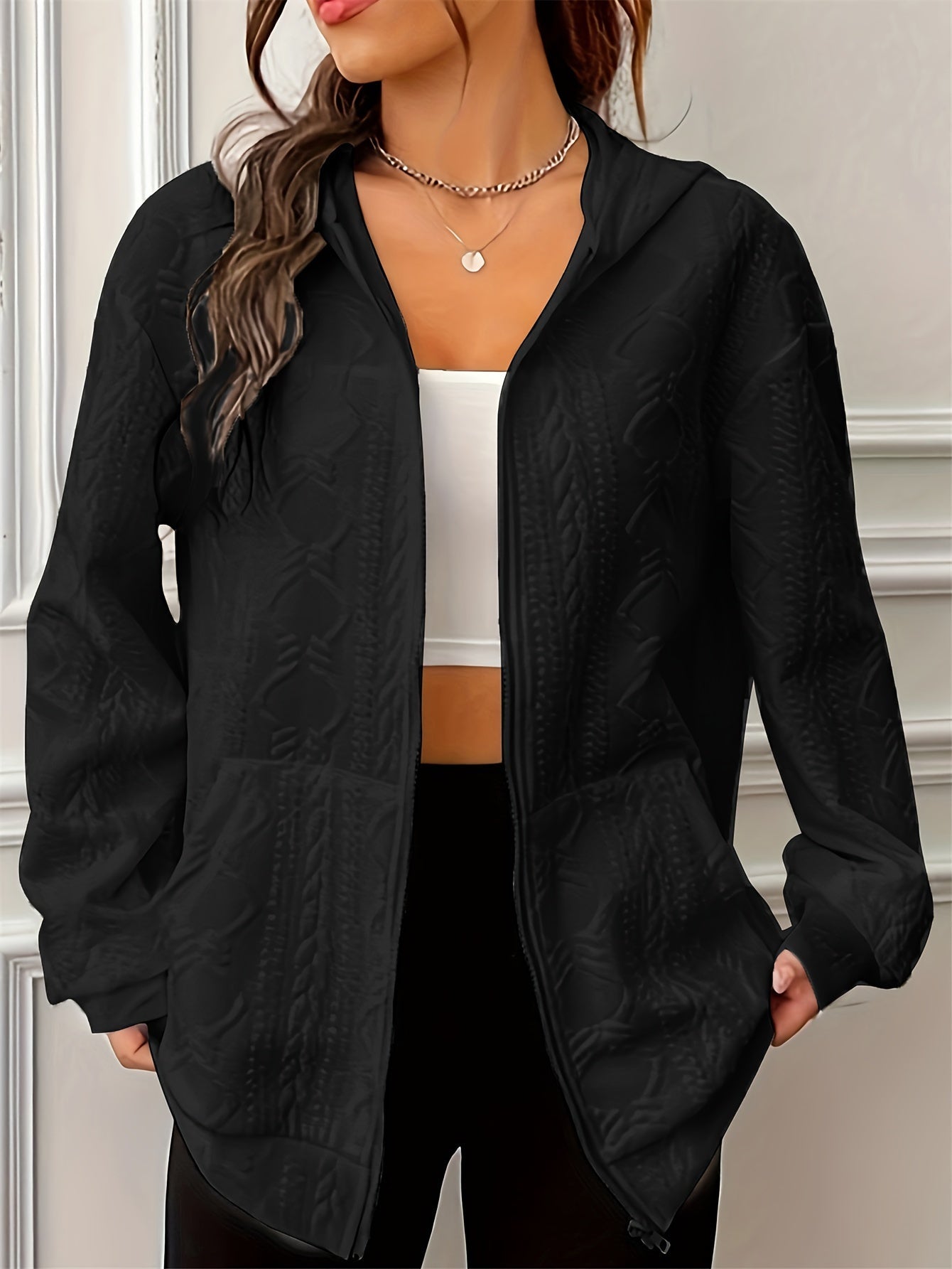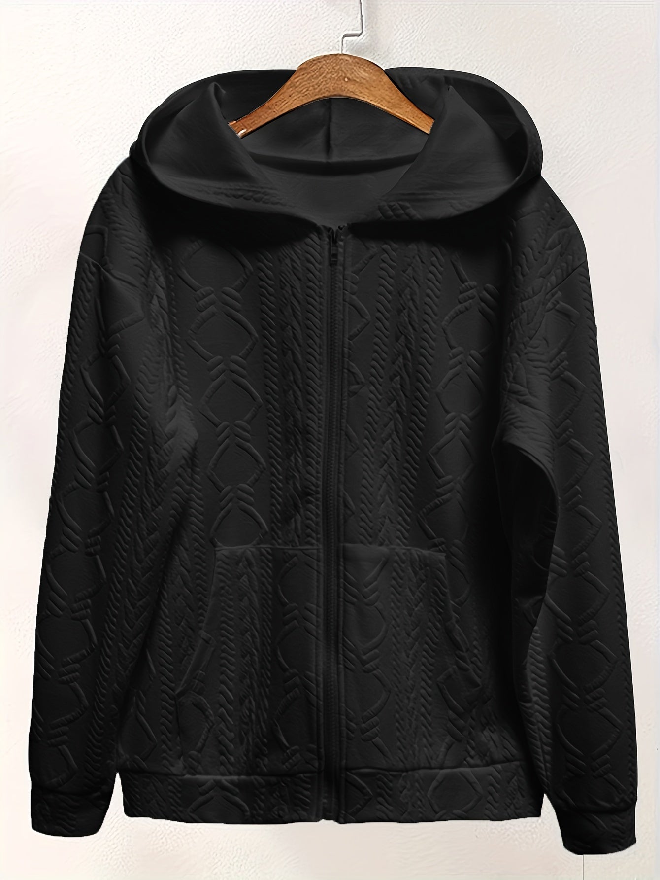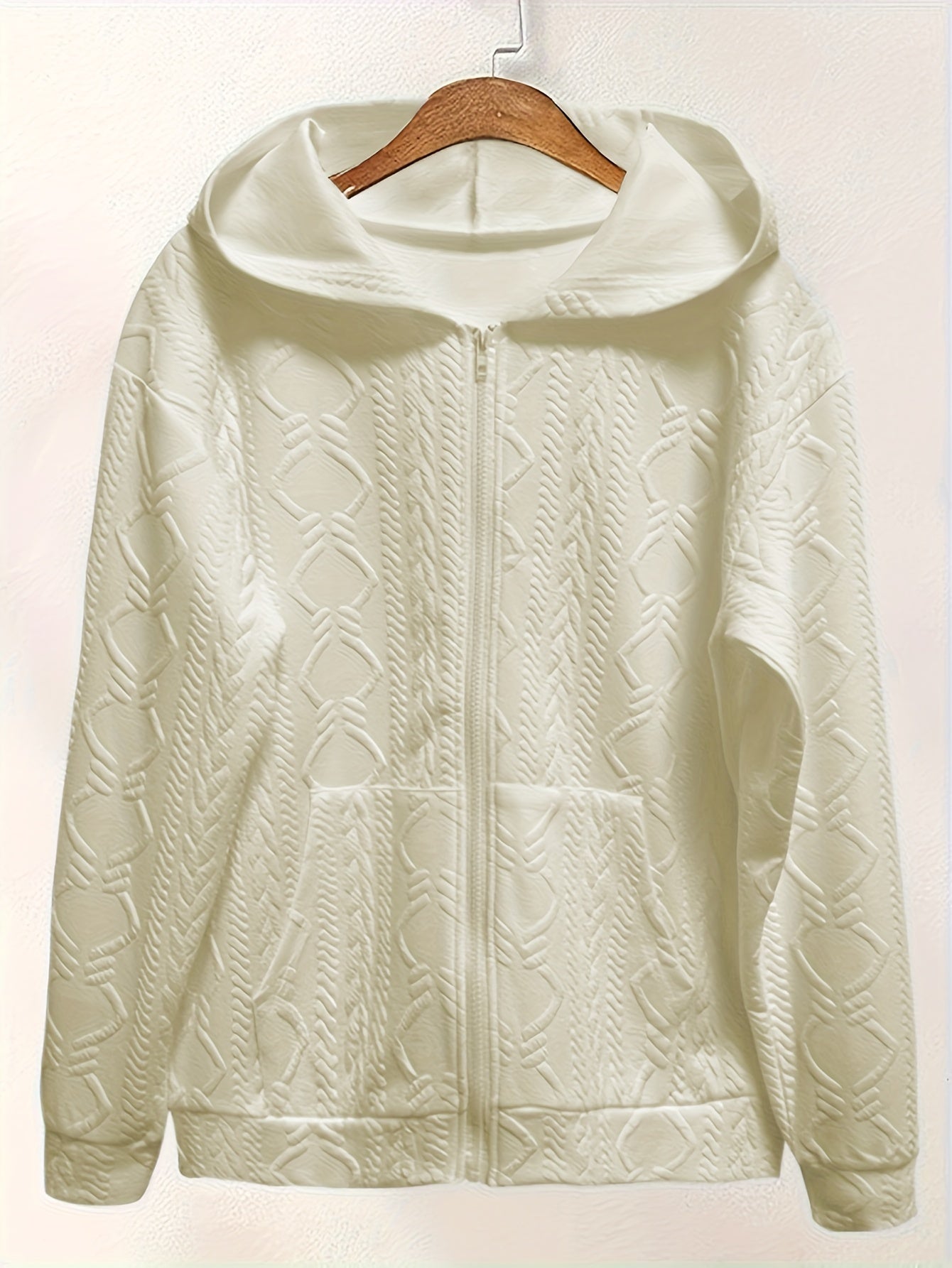 Die Zopfstrick-Textur verleiht dieser Kapuzenjacke einen besonderen Akzent, der sie von klassischen Sportjacken abhebt. Der durchgehende Reißverschluss und die praktische Kapuze machen sie besonders funktional, während die seitlichen Taschen Platz für Ihre alltäglichen Essentials bieten. Perfekt für kühle Tage im Frühling oder Herbst.