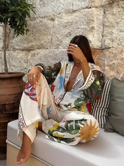 Lust auf etwas Frisches und Bequemes? Dann ist dieses Set genau das Richtige für dich! Das langärmelige Shirt trifft auf die perfekt sitzenden elastischen Hosen – ein unschlagbares Duo für den Tag. Der einzigartige Print lässt dich immer auffallen, egal ob beim Spaziergang oder beim Treffen mit Freunden.